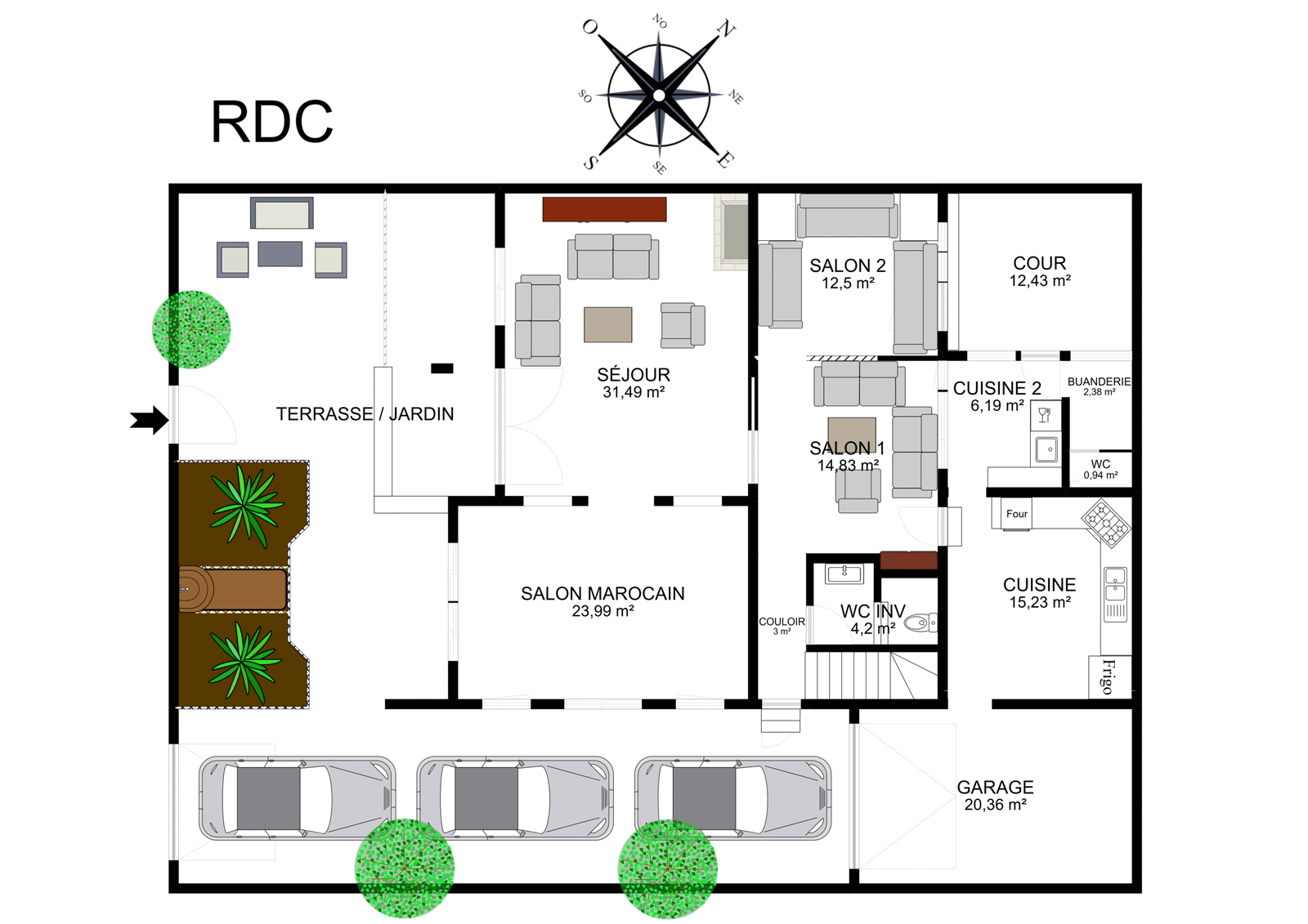 À l'intérieur, vous trouverez trois cuisines bien aménagées, offrant une commodité et une flexibilité ultimes. Le grand salon marocain est un point fort, avec de superbes meubles anciens et de magnifiques plafonds anciens, dégageant une élégance intemporelle parfaite pour recevoir des invités.